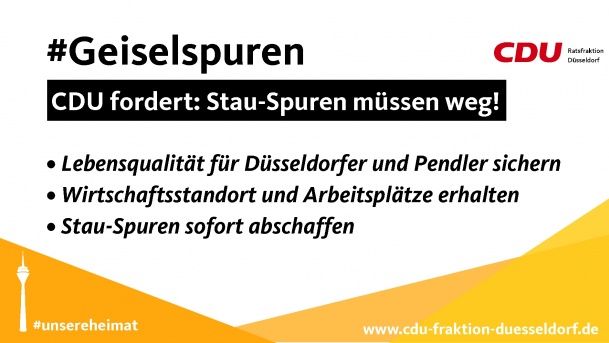 Die CDU-Fraktion wird im Haupt- und Finanzausschuss und auch im Rat das Aus für die „Umweltspuren“ beantragen. Die Schmerzgrenze für Düsseldorfer und Pendler sei überschritten, so die Union. Zudem zeige Oberbürgermeister Thomas Geisel trotz Dauerstaus und stärkerer Luftbelastung keinerlei Einsicht, den irrigen Versuch abzubrechen. Stattdessen habe er in seiner heutigen Pressekonferenz die Sonderspuren als alternativlos verteidigt. Damit nehme Geisel Unfall- und Gesundheitsrisiken für die Menschen weiterhin bewusst in Kauf und störe den sozialen Frieden in der Stadt.