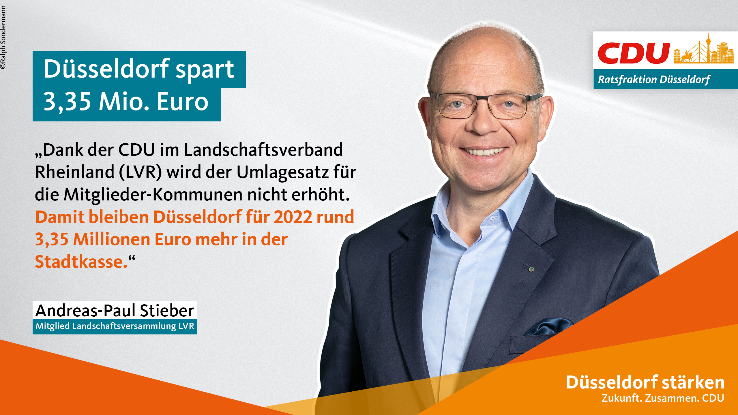 Ratsherr Andreas-Paul Stieber, Mitglied der Landschaftsversammlung beim LVR, zeigt sich erfreut: „Das ist ein wichtiges Zeichen von Solidarität und Rücksichtnahme in Zeiten der Krise. Ich bin den CDU-Kolleginnen und CDU-Kollegen im Landschaftsausschuss sehr dankbar, dass sie bereit sind, auf eine Erhöhung des Umlagesatzes zu verzichten. Von dieser Entscheidung profitiert auch der städtische Haushalt von Düsseldorf: Im kommenden Jahr zahlt die Stadt fast 3,35 Millionen Euro weniger an den LVR. Das erhöht unseren finanziellen Gestaltungsspielraum.“