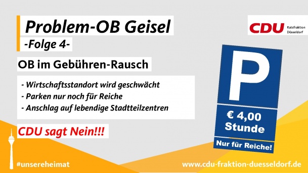 Die CDU-Ratsfraktion läuft Sturm gegen den jüngsten Vorstoß von Oberbürgermeister Thomas Geisel zur Verteuerung der Parkgebühren. Geisels erbitterter Kampf gegen das Auto nehme nun groteske Züge an, so die CDU. Autofahrende sollen mit aller Macht zum Aufgeben gezwungen werden. „Umweltspuren“, erhöhte Parkpreise und womöglich noch eine City-Maut seien ein Anschlag auf das städtische Leben in Düsseldorf. „OB Geisel will eine tote Stadt“, warnt die Union.